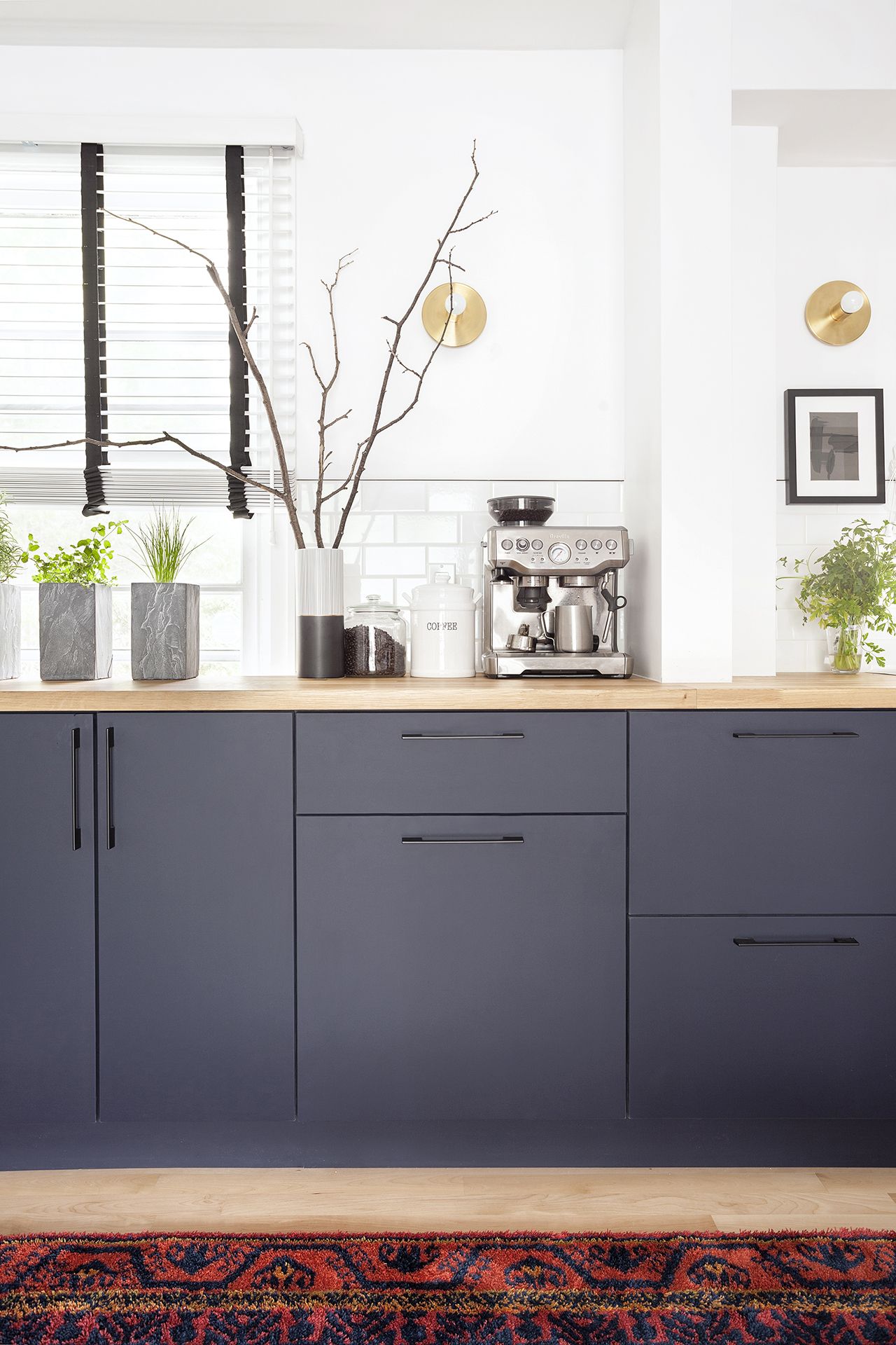 This unconventional kitchen has everything to be functional. The counter-bar fits in perfectly while taking up little space. The storage wall near the refrigerator allows for a large built-in pantry and opts for shelving elsewhere in this kitchen. By continuing the countertop into the dining room, we were able to add work and storage space as well as a nice coffee nook.